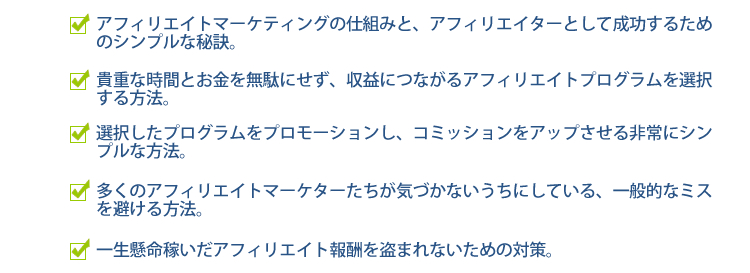 本コースは特に初心者を念頭に作成されたものですから、これまでアフィリエイトプログラムに参加したことのない人でも、ビジネスを立ち上げるためのノウハウをすぐに理解することができます。