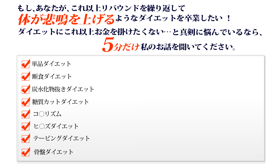 あなたの体が本来持っている基礎代謝をアップさせ、ダイエットに関するメンタルコントロールを手に入れ、リバウンド知らずの体を手に入れることが出来ます。