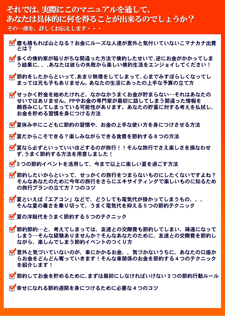 このマニュアルは、手に入れてすぐに、日々の生活の中で無駄なもの、節約できるものを洗い出し、