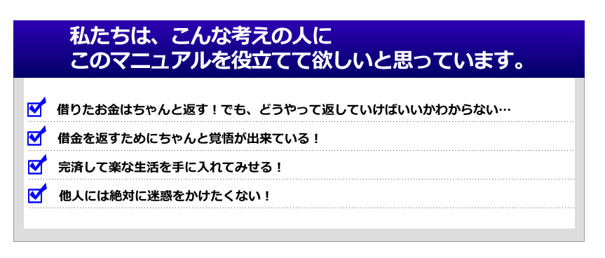 このマニュアルは「これ以上、借金で苦しみたくない!」「他人に迷惑をかけたくない!」と、強く願っている、あなたにお贈りしたいのです。