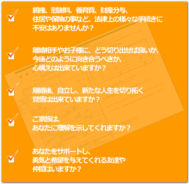 新宮市在住 Nさん(女性/29歳) もし、このマニュアルの存在を知ることなく、離婚のプロセスを踏んだとしたら…今の私は、こんな精神状態にはならなかったかも知れません。何故なら常日頃より精神的に弱い私が、一大決心して離婚に臨んだのですから。このマニュアルは、離婚後のメンタルケアに関する知識やノウハウが、かなり充実しています。たとえば、髪型を変える、音楽を聞く、新しい服を買う、新しい友達をつくるなど、一見当たり前に思えるような事柄について、詳細な解説が為されています。実は、離婚のダメージを払拭するために必要となる、理に叶ったケアプログラムを解説してくれていたのです。おかげさまで、マイナスイメージを引きずることなく、割と早い段階で気持ちをプラスに切り替えることが出来るようになったと思っております。 |