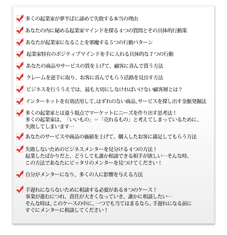 リスクを最小限に抑えて、事業をスタートさせる方法や、くじけない心を養う方法などを