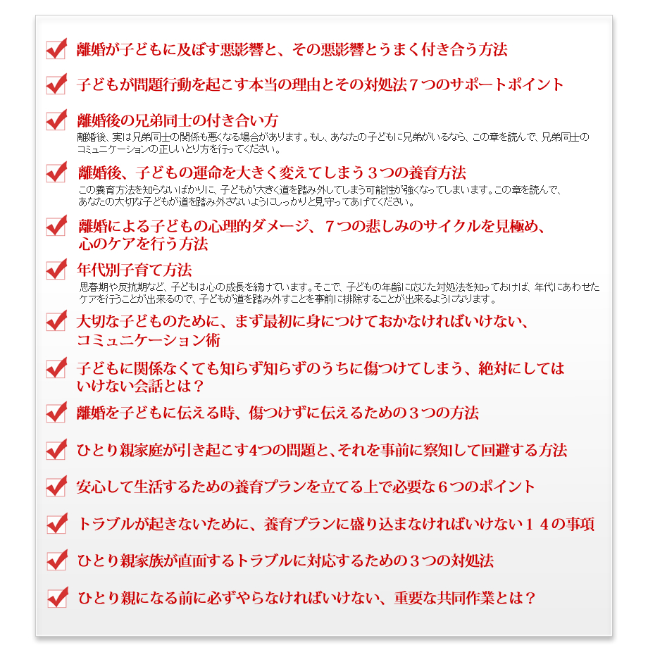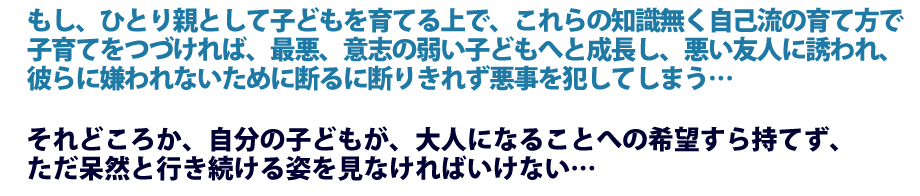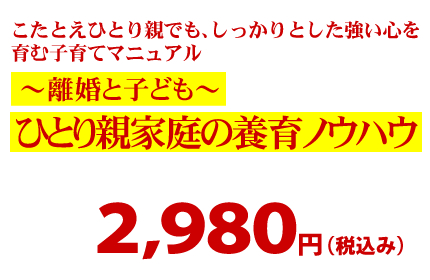 それとも、自分らしさを見つけ、イキイキと成長する子ども、また、悪い友人からの甘い誘惑に乗ることなく、自分の意思を貫く、強い心を持った子どもに育てるための、ひとり親のための養育マニュアルを、2980円で手に入れますか?