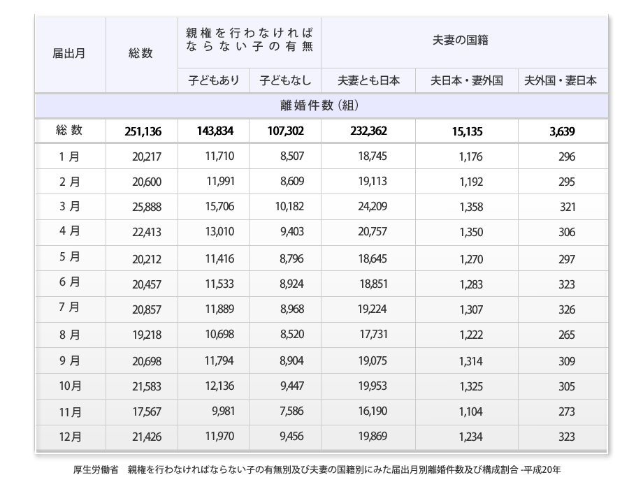 しかし、平成20年に厚生労働省が調査した離婚件数の結果によると