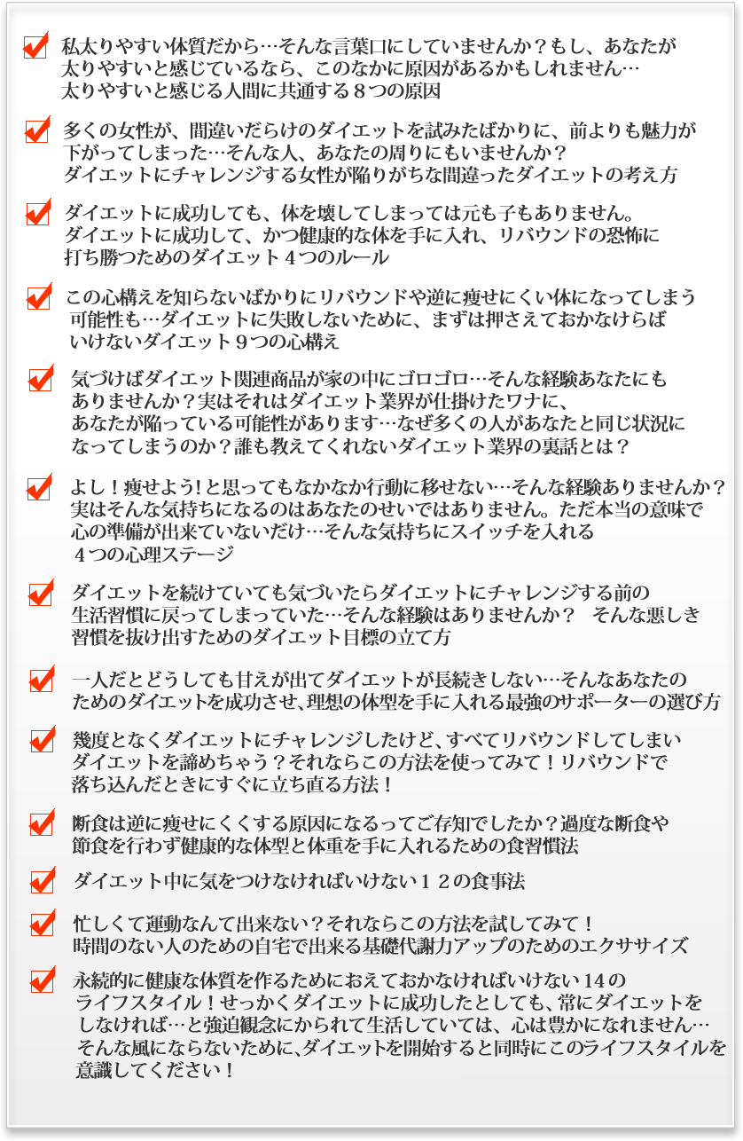 など、ここでは一部しか紹介できませんが、あなたがこれから先、ダイエットを卒業し、リバウンドに悩まされることのない日常を過すために必要な方法がぎっしりと詰めこまれています。