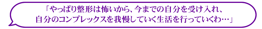 あなたは、これから先ずっとご自分のコンプレックスに不満を感じながら、一生このままの人生を受け入れる…または、医者の言われるまま美容整形を受け、予想外の費用の支払いと、後遺症に悩まされる日々を過ごしますか?