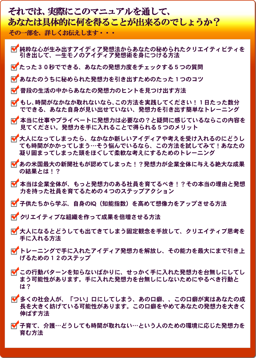 これは、あなたがこのマニュアルを通して、発想力に富んだ体質を身に付けてしまえば、