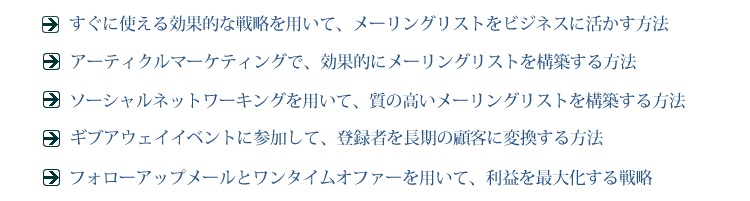 質の高いメーリングリストを構築するノウハウを身につけて、あなたの商品やサービスを効果的にプロモーションしましょう!